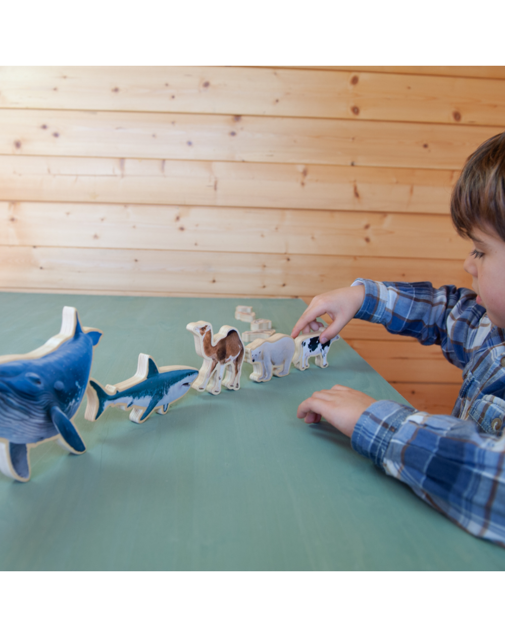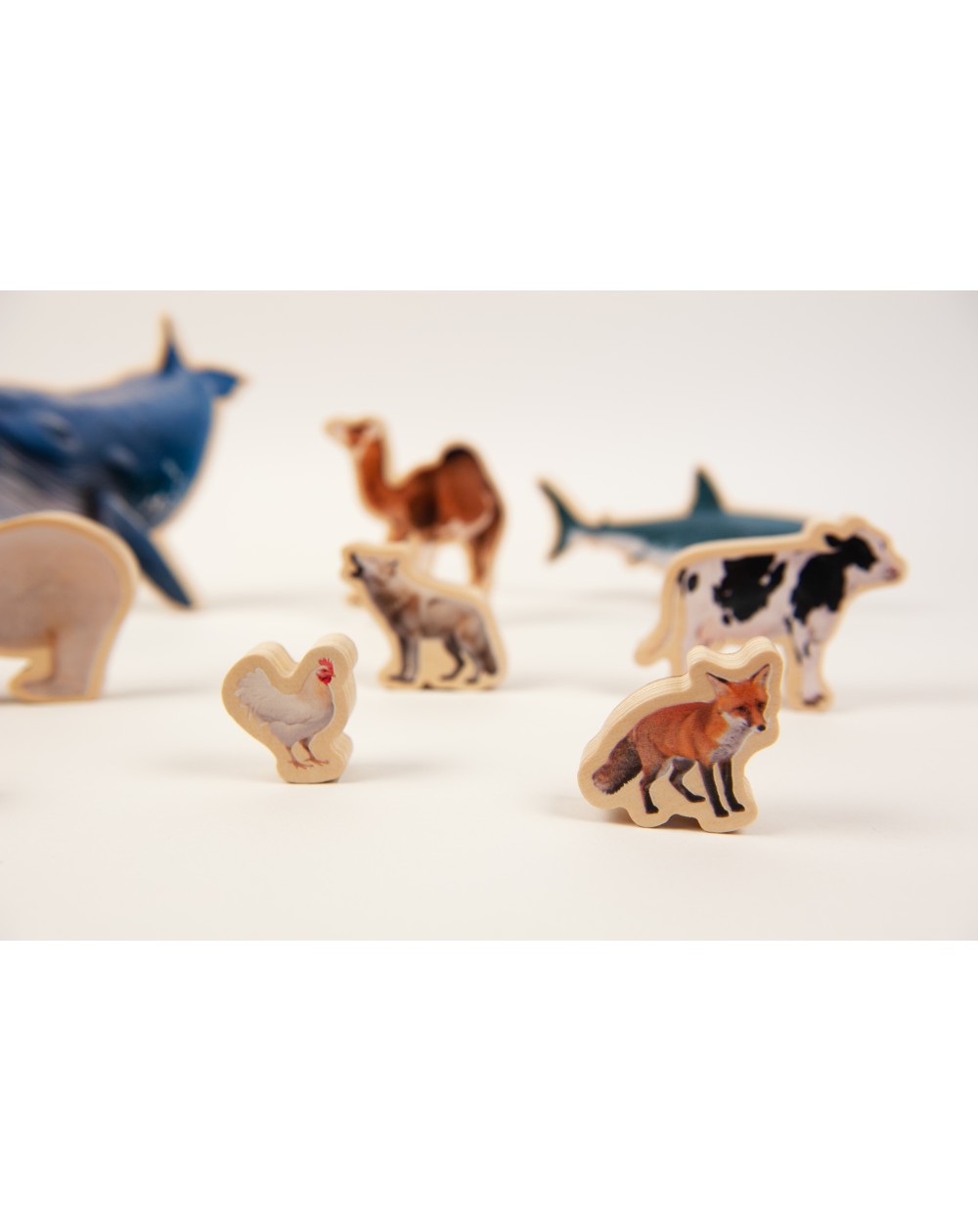 Tablero con 9 animales para encajar. Clasifica los animales por tamaño y peso. Colócalos de mayor a menor o viceversa y consulta las tagetas informativas de cada animal, para aprender sobre su peso, su tamaño y su hábitat. Los animales se aguantan de pié, para jugar como complemento de los minimundos o creando situaciones imaginárias. Incluye saco de tela. Medidas de la ballena 17 cm x 14 cm. Base 30 cm diámetro.