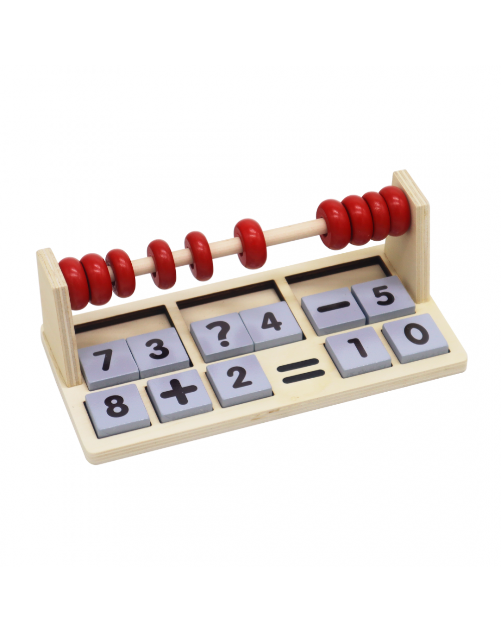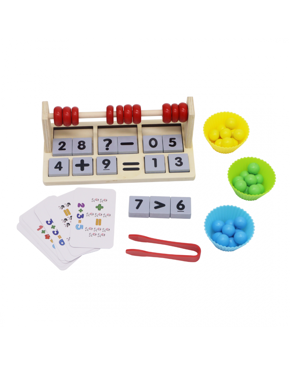 Tablero de madera para realizar operaciones matemáticas básicas. Sumas, restas, mayor que, menor que. Incluye 15 cartas de doble cara, 3 cestas, pinzas y bolas de conteo. 22 x 7,5 cm.