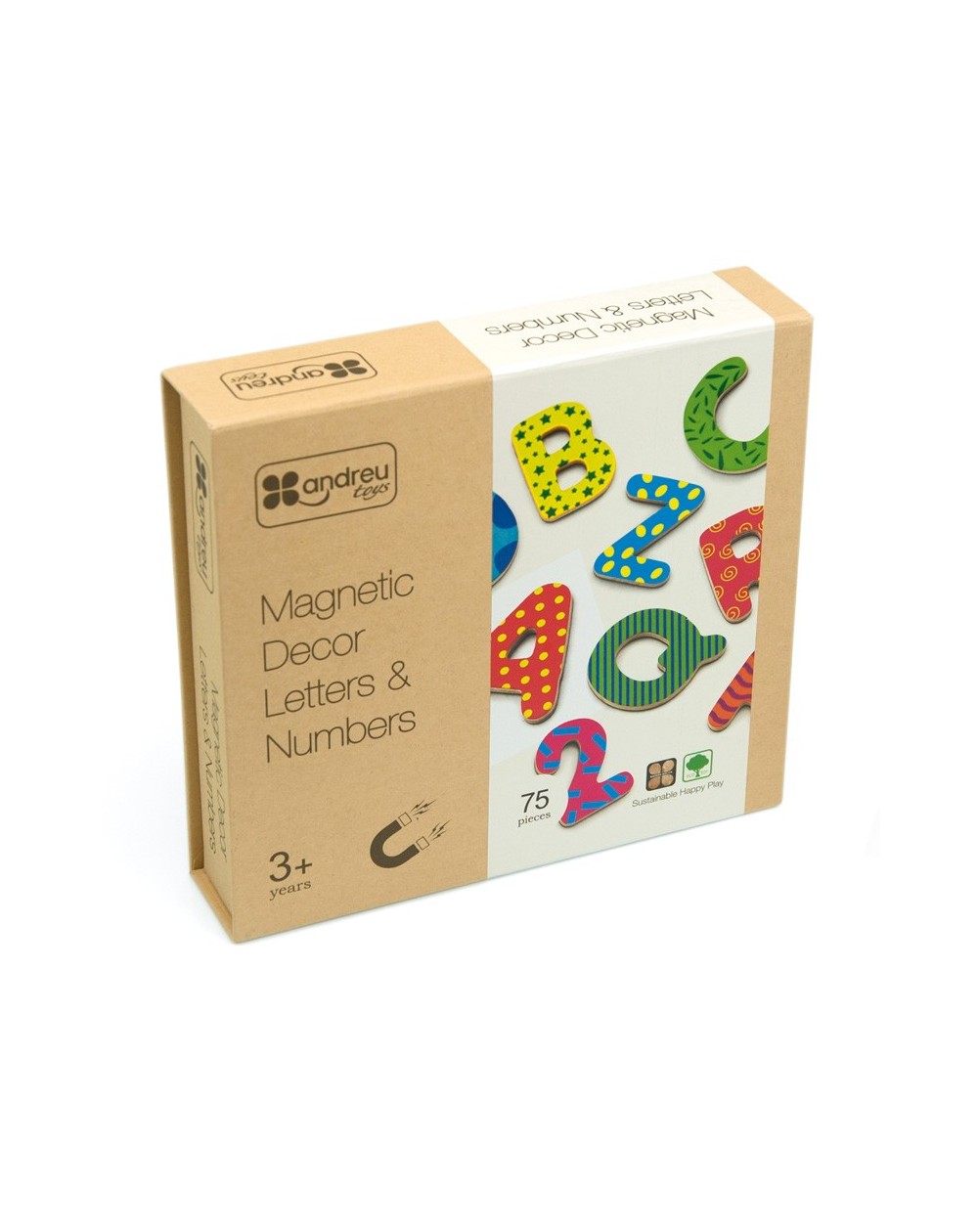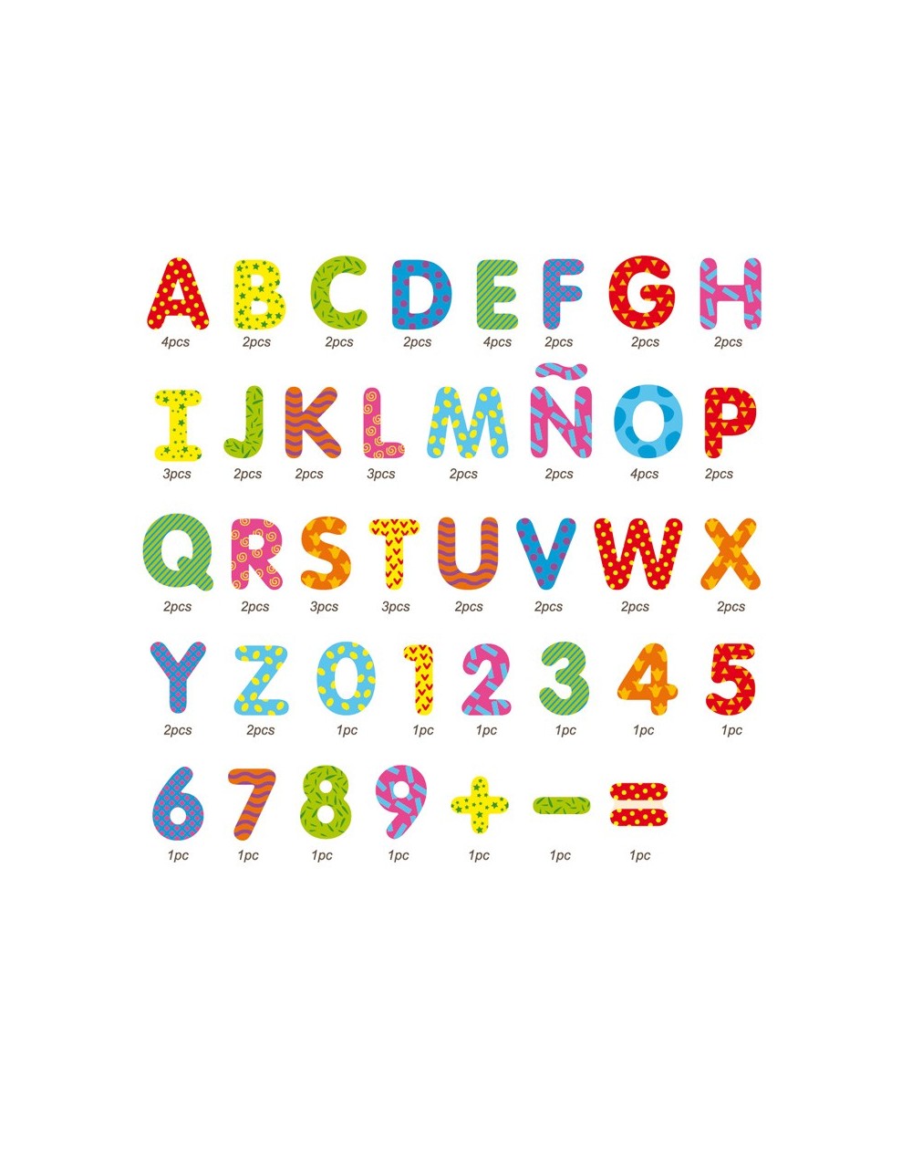 Caja que contiene letras y números decorados magnéticos. Incluye los signos de suma, resta, multiplicación y división.