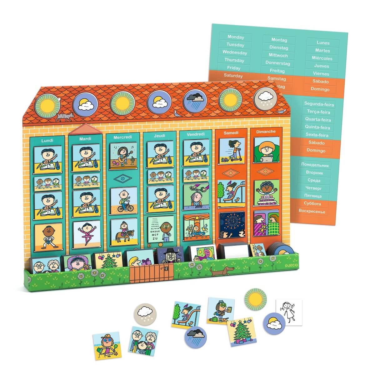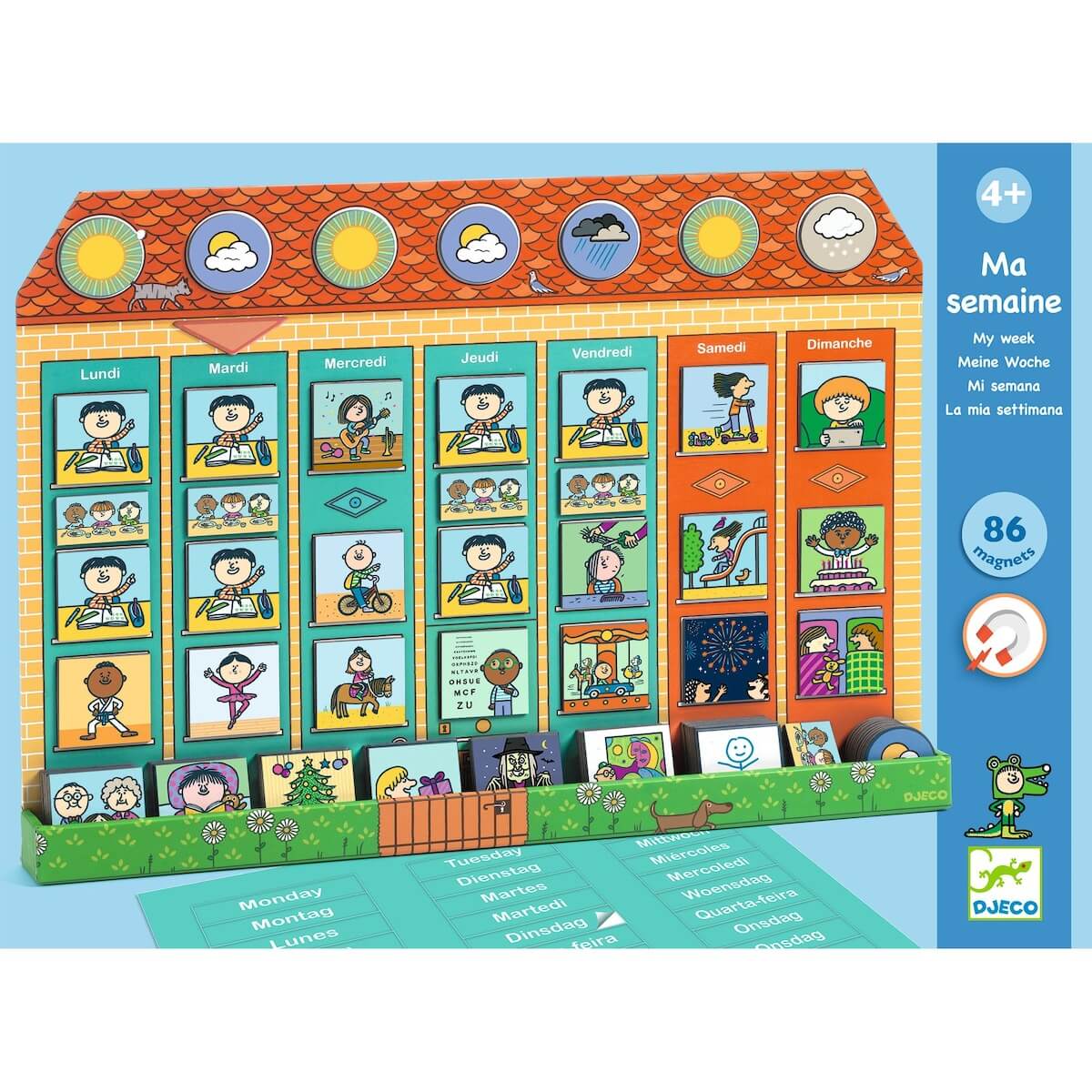 El tablero tiene una forma de casa gigante, lo que lo hace visualmente atractivo y fácil de integrar en cualquier habitación. Con dimensiones amplias y un diseño colorido, se convierte en un centro de atención que capta el interés de los más pequeños. Incluye 85 imanes de diversas formas y colores que representan actividades, tareas y eventos cotidianos. Estos imanes se colocan en el tablero para representar la semana de una manera clara y visual, permitiendo a los niños ver sus horarios y responsabilidades de un vistazo.