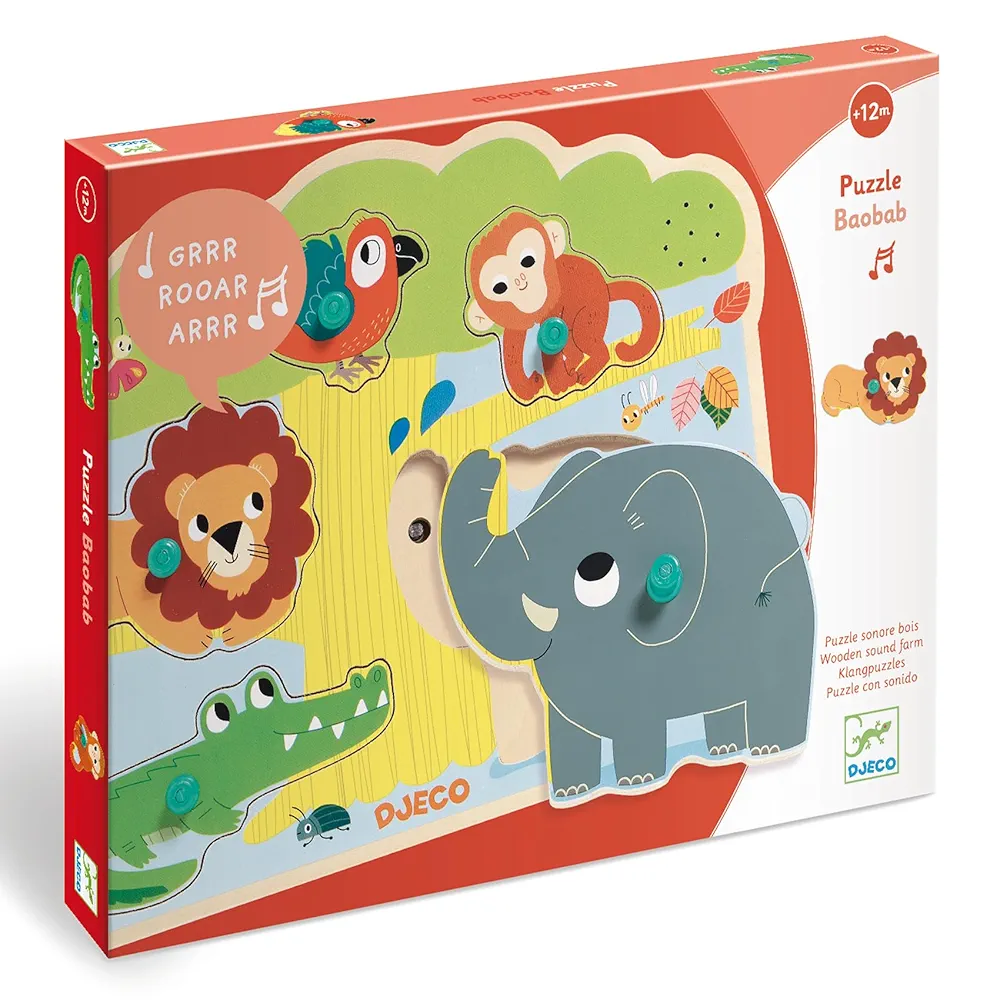 Baobab es un puzle de madera encajable y con sonido sobre el tema de la sabana.